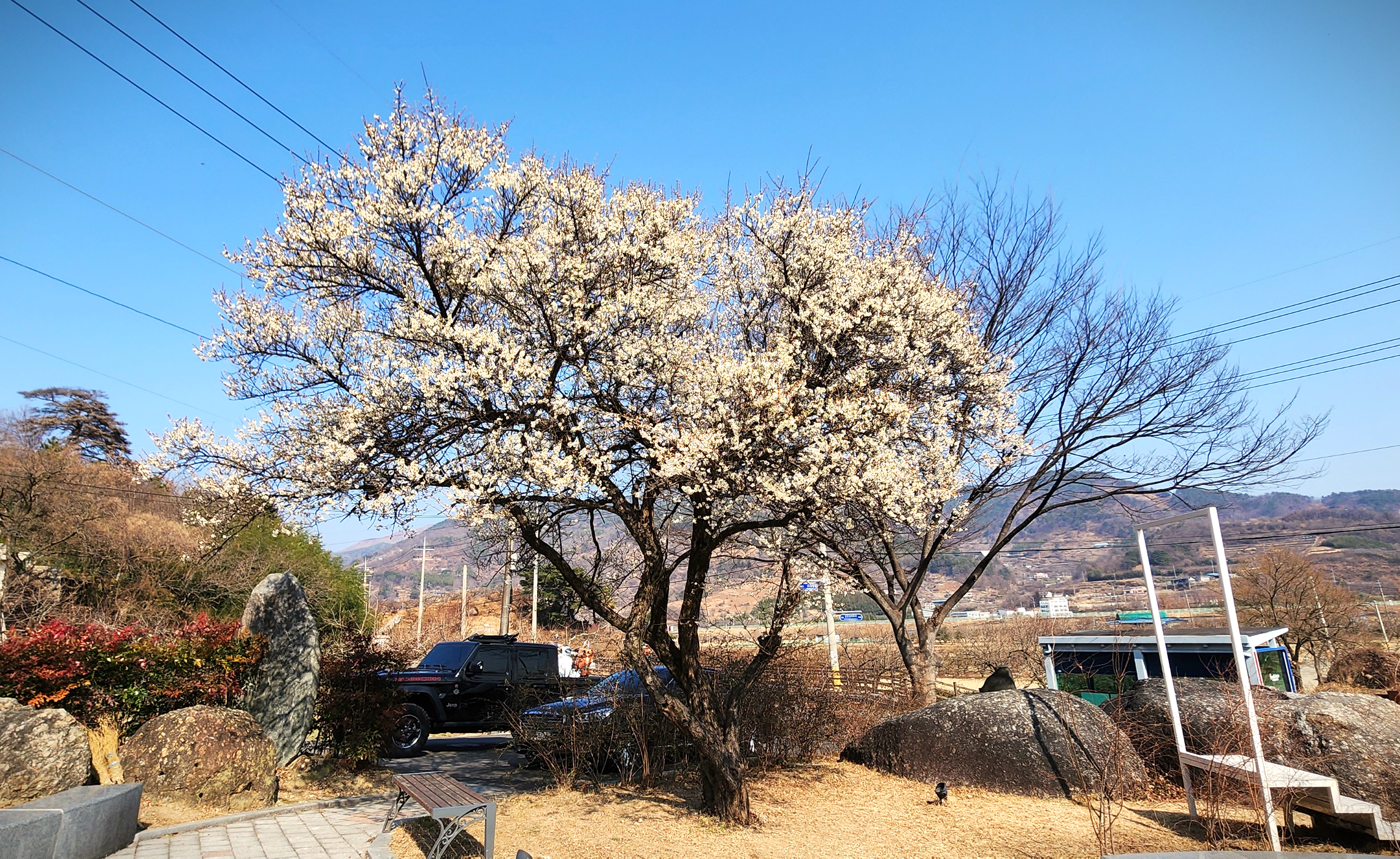 이 매화는 인위적으로 다듬어진 느낌이 아니라 자연 그대로의 형태를 유지하고 있어, 사진보다 실제로 마주했을 때 훨씬 깊은 인상을 준다. 가까이 다가가면 꽃잎 하나하나가 또렷하고, 멀리서 바라보면 나무 전체가 하나의 봄 풍경이 된다.